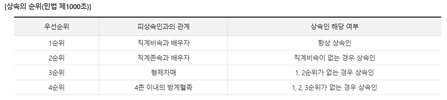 ▶ 같은 순위의 상속인이 여러 명인 경우 : 피상속인과 촌수가 가까운 자가 상속인이 되고, 촌수가 같은 상속인이 여러 명인 경우에는 공동 상속인이 됩니다.