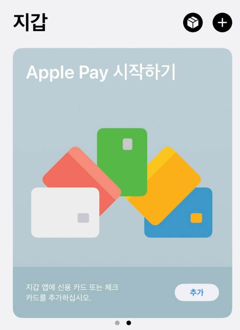 아이폰 어플 중에 '지갑'이라는 어플이 있습니다. 그리고 지갑 어플을 실행하면 'Apple Pay 시작하기'라는 문구가 나옵니다. 하단에 '지갑 앱에 신용 카드 또는 체크카드를 추가하십시오'라는 문구와 함께 우측에 '추가' 버튼이 있습니다. 여기서 추가 버튼을 누르면 카드를 등록하실 수 있습니다.