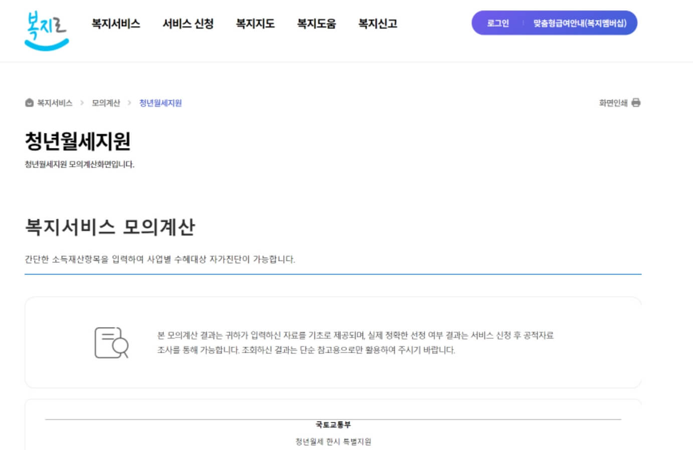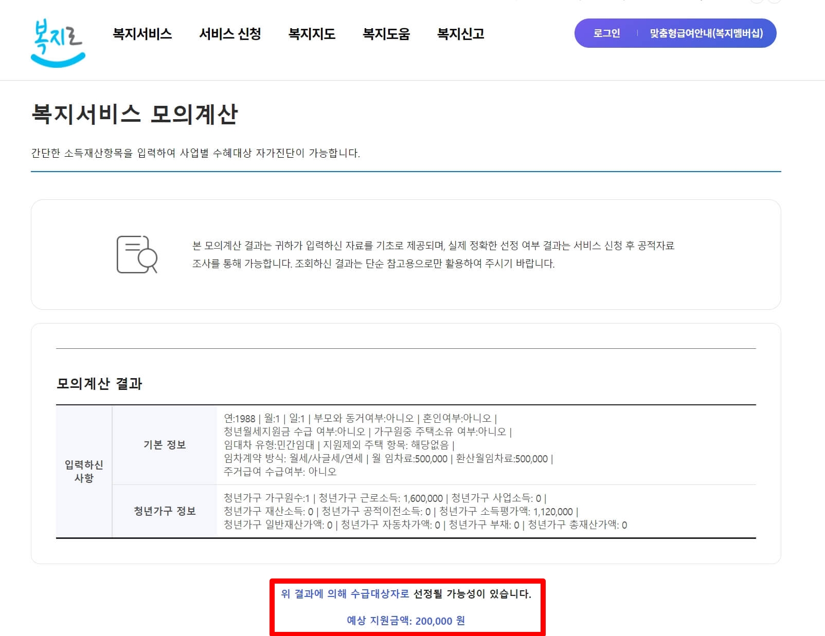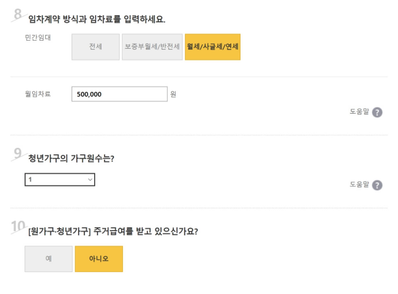 복지로 - 청년월세지원 모의계산