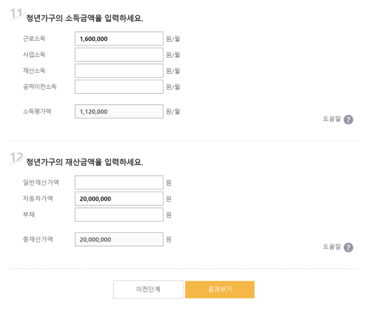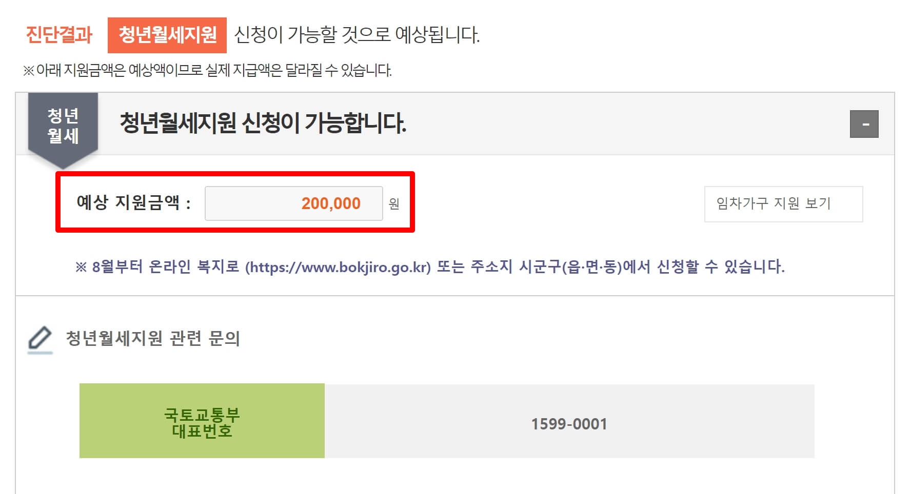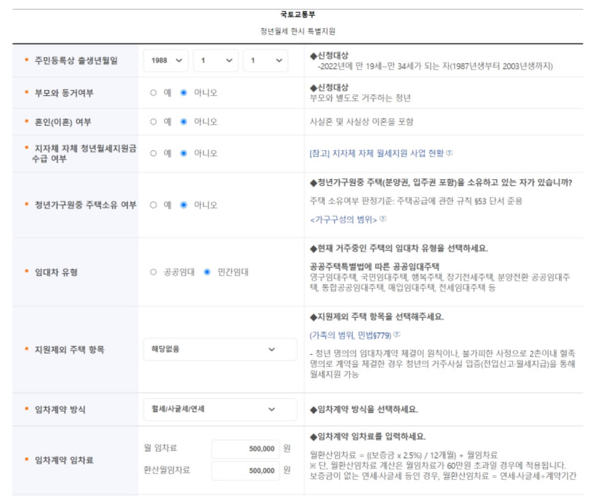 복지로 - 청년월세지원 모의계산