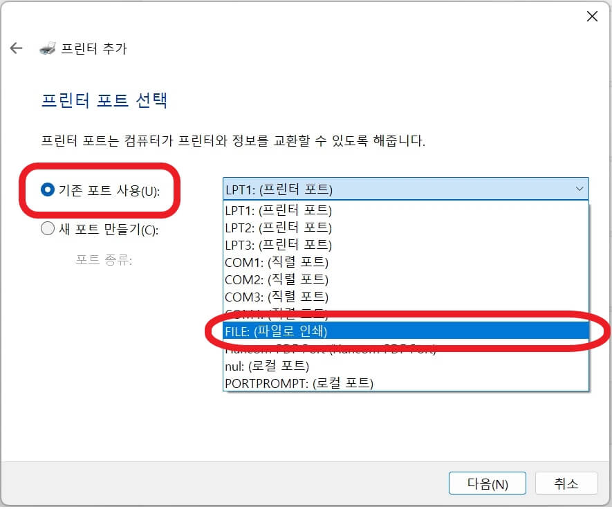 '기존 포트 사용'을 클릭합니다. 그리고 'FILE: (파일로 인쇄)'를 선택 후 다음을 클릭합니다.