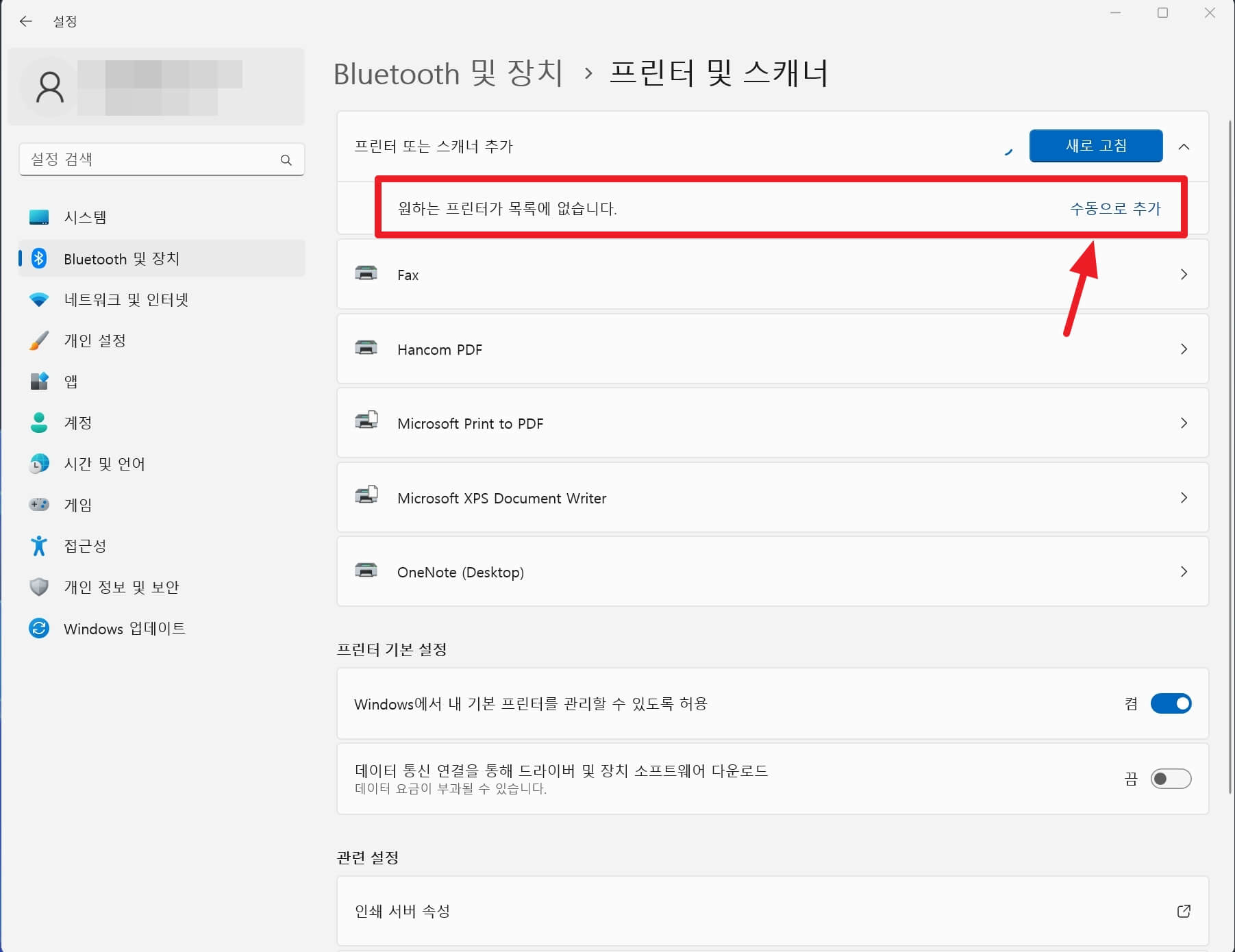 '원하는 프린터가 목록에 없습니다. 수동으로 추가'를 클릭합니다.
