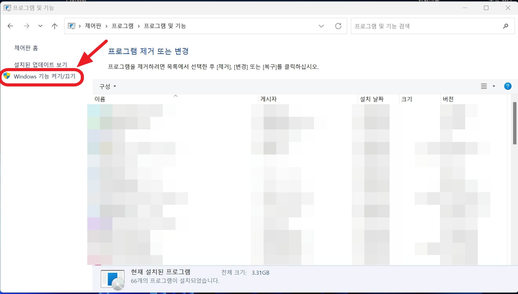 좌측에서 'Windows 기능 켜기/끄기'를 클릭합니다.