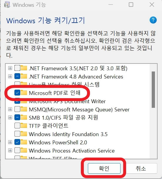 'Microsoft PDF로 인쇄' 라는 항목 왼쪽 체크를 해주시고 확인을 클릭합니다.