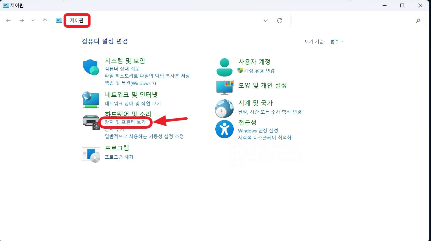 '제어판'으로 들어갑니다. 그리고 '장치 및 프린터 보기'를 클릭합니다.