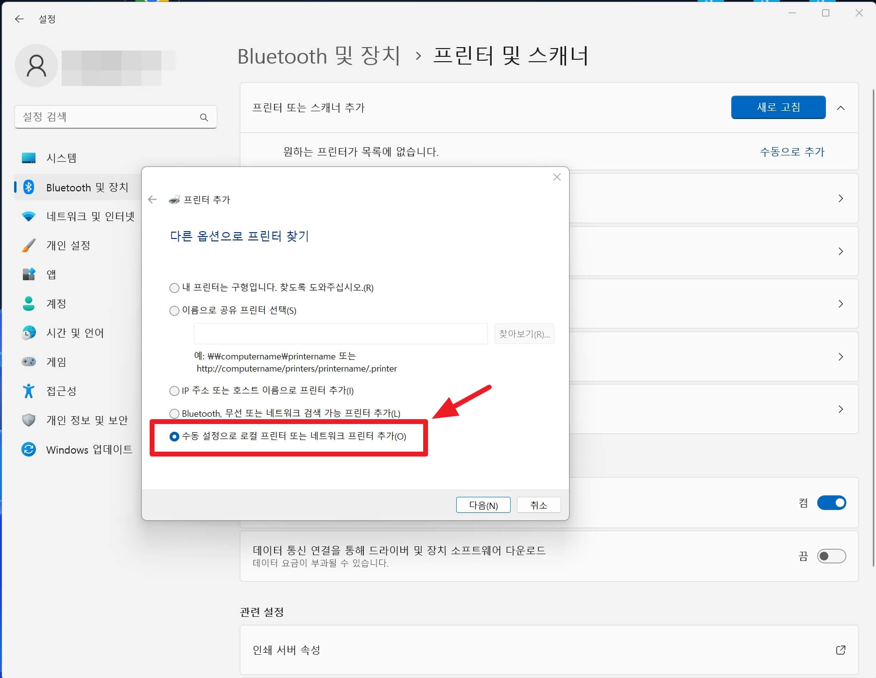 '원하는 프린터가 목록에 없습니다. 수동으로 추가'를 클릭합니다.