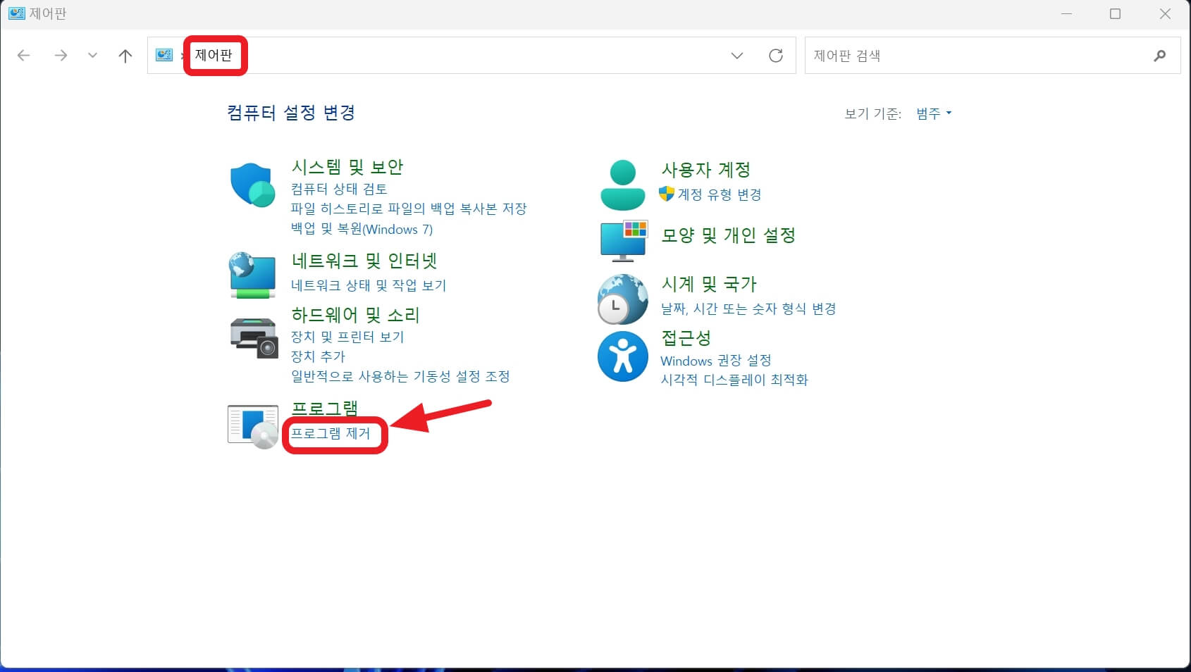 '제어판'에서 '프로그램 제거'를 클릭합니다.