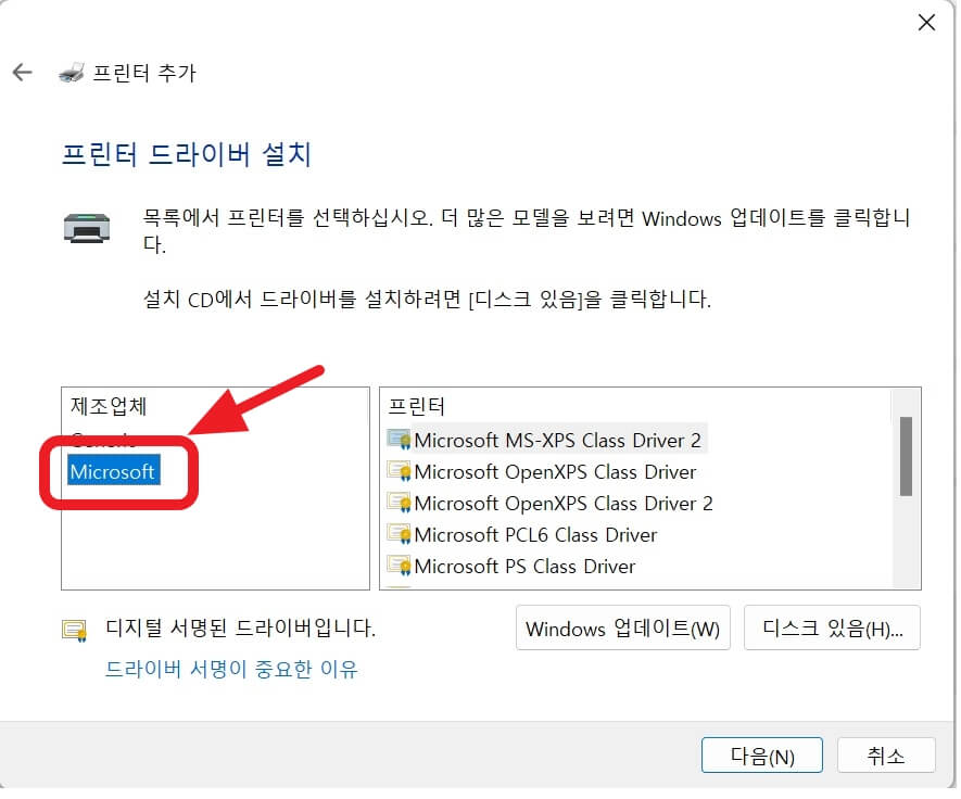 좌측에 있는 제조업체 에서 'Microsoft'를 선택합니다. 그리고 우측에 있는 프린터에서 Microsoft Print to PDF 항목이 있으면 선택하고 다음을 누르고 설치를 하면 됩니다.